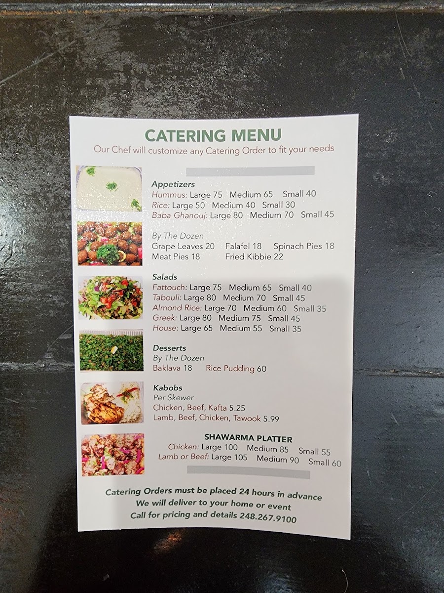Chicken shawarma, beef shawarma, spinach pie, meat pie, grape leaves, falafel, fried kibbee, Baba ghanouj, hummus and tabouli.